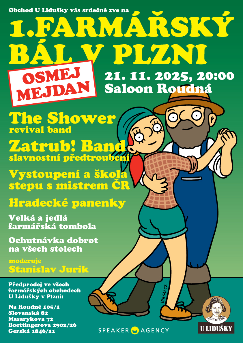 Osmý ročník akce pro farmáře, jejich zákazníky a přátele - plzeňské Obchody U Lidušky a Speaker Agency zvou na bohatý program, skvělou jedlou tombolu a farmářské dobroty, které budou opět na každém stole v sále. Hrají The Shower, vystoupí mistr ČR ve stepu Matěj Borovský a před půlnocí jako překvapení proběhne veselý taneček v podání Hradeckých panenek. Bál nemá předtančení, ale předtroubení - zahraje ho Zatrub! Band. Moderuje Stanislav Jurík. Poslední lístky budou v prodeji před zahájením přímo na místě.